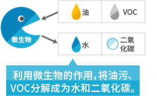 土壤、海洋及地下水等自然界中生存着多种多样的微生物。其中一部分以摄取油类及VOC为食,将其分解为水和二氧化碳。