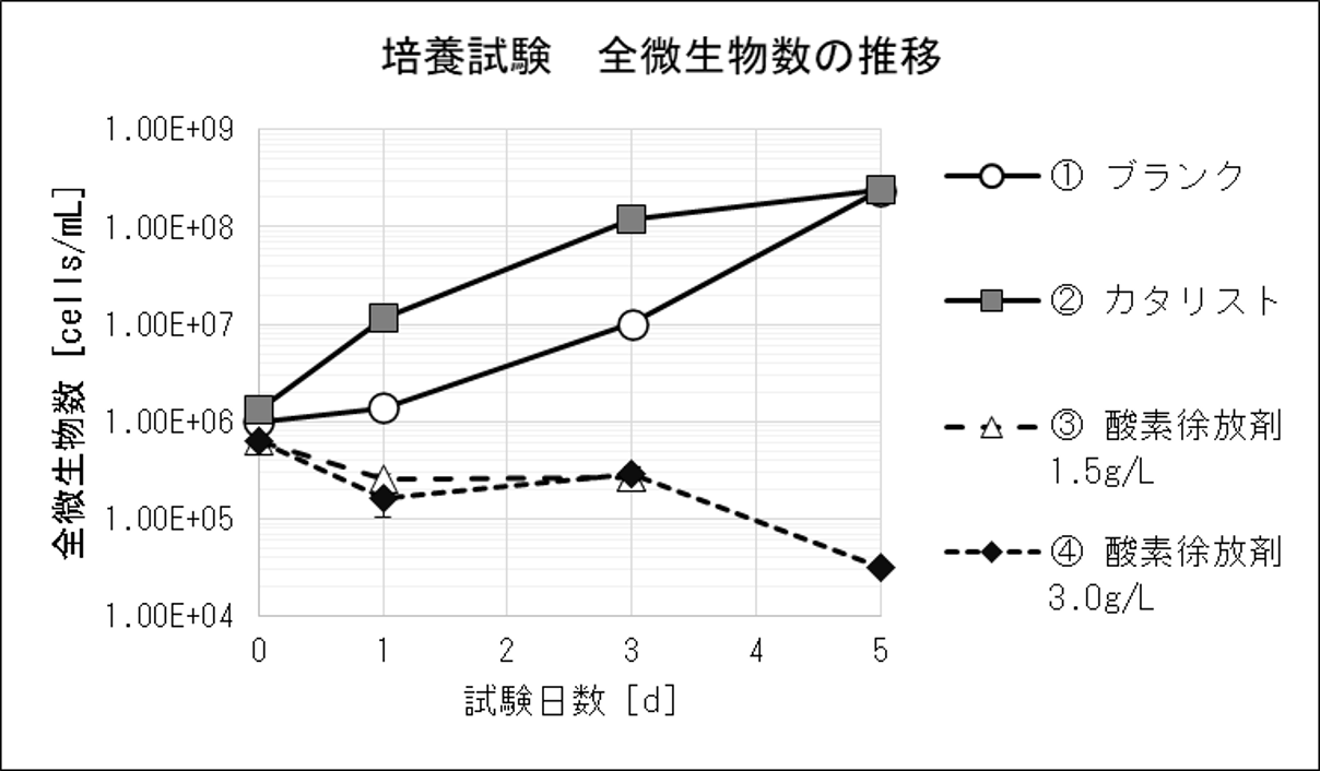 一方で、酸素徐放剤を添加した系列③、④は微生物の増殖が認められず、減少していく結果となった。系列③は、5日後に原液0.1mlをn=3測定した結果、1 cellも観察できなかったため、0 cells/mlとしている。